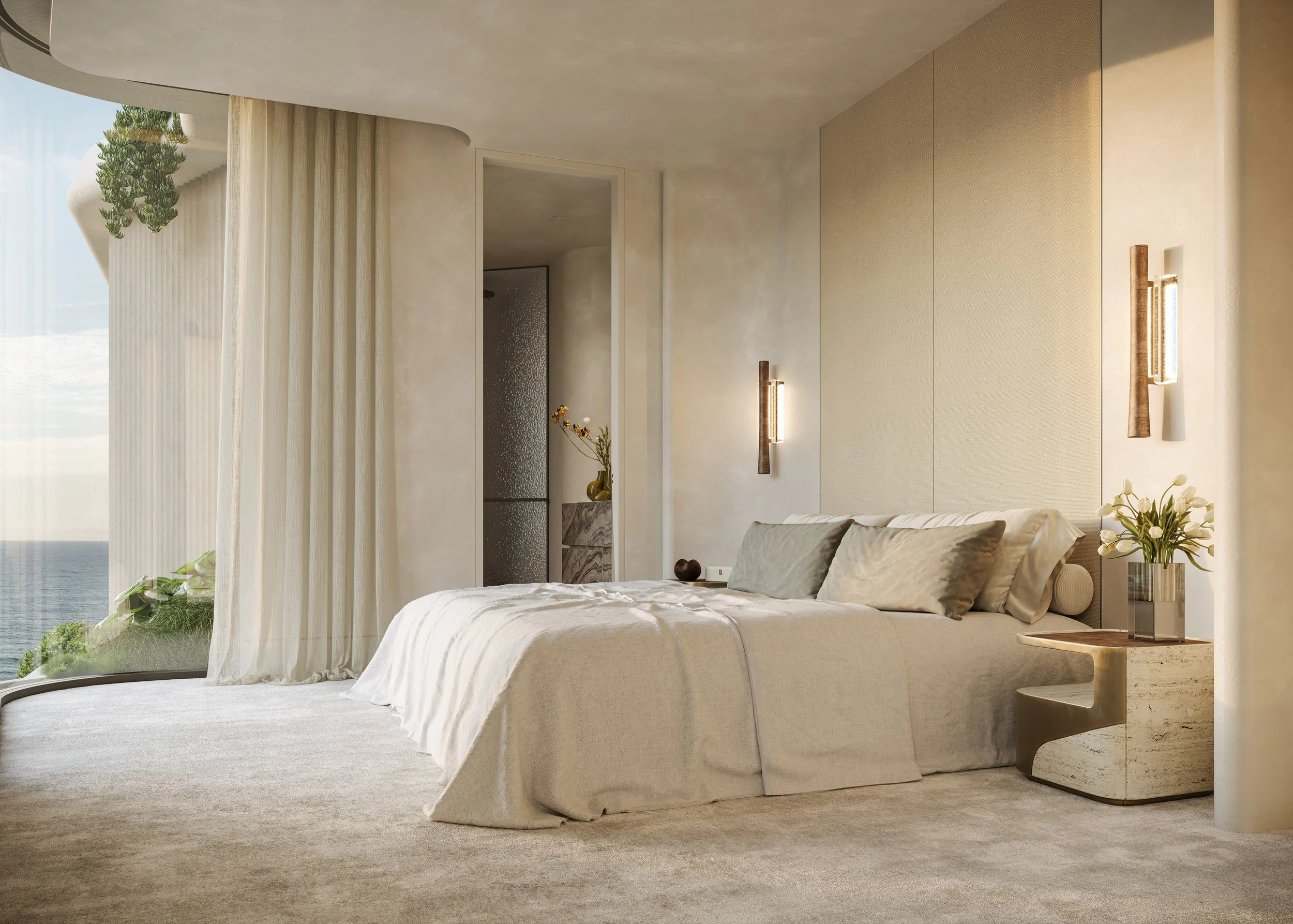 The curvilinear architecture shapes the interior expression, with rounded forms flowing from exterior to interior, echoed in sculpted islands, scalloped wall details and gently arcing niches. Light settles on these surfaces with ease, softening edges and imbuing each home with a calm, tactile stillness.
